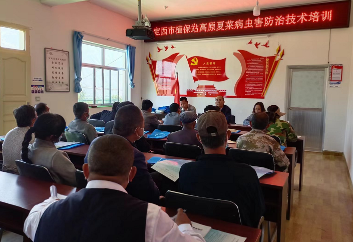 近日,定西市植保植检站技术人员赴漳县武阳镇柯寨村组织开展“三区”科技培训,两名植保技术人员就农药安全使用知识、高原夏菜病虫害防治技术进行集中培训。本次活动以培训讲座为主,互动交流和咨询问答相结合的形式开展,村社干部、产业带头人、种植户约60余人参加。培训会上散发《高原夏菜病虫害识别与防治》《农药安全使用知识》《农药识假辨伪维权手册》等200余册植保技术培训教材,发放《农药包装废弃物回收处理管理办法》100余张宣传海报和植保技术宣传资料袋100余个。