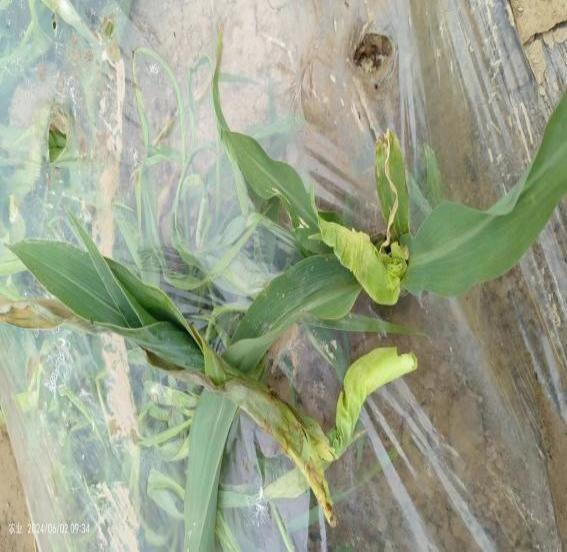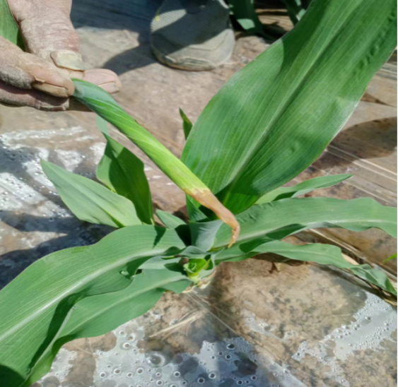 由于近期连阴雨,天气放晴后极其有利于植物病虫害发生与流行。当前,陇西县玉米已出现了芯叶扭曲的症状,主要发生在福星、宏伟、权家湾、首阳、通安驿等海拔1900米以上的区域。发生特点为同一块田地靠近田埂背风处发生程度轻,地势开阔迎风面发病重;抗逆性较强的品种轻于抗逆性差的品种;低海拔区域发病轻,阳山区轻于阴山区。根据目前发病症状,疑似玉米顶腐病。 一、发生症状 发病田块玉米出现植株心叶发黄并且心叶最外层叶片紧紧包裹内部心叶,使其不能展开而成鞭状扭曲,扭曲部位叶片干枯皱缩并且有断掉的现象,剖开茎基部,发现内部暂时没有坏死、溃疡等症状。 二、发生原因 部分品种抗逆性差,再加上近期阴雨天气较为频繁,低温寡光照,田间湿度大,加快了病原菌的侵染流行。