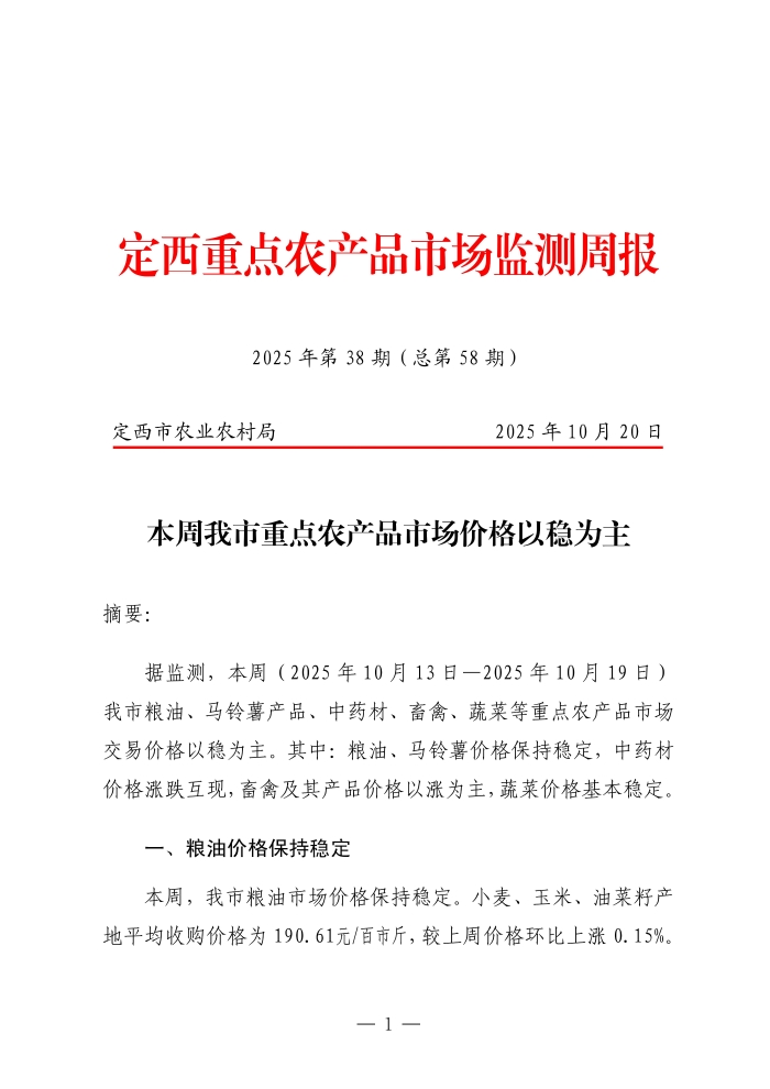 定西重点农产品市场监测周报(2025年第38期)