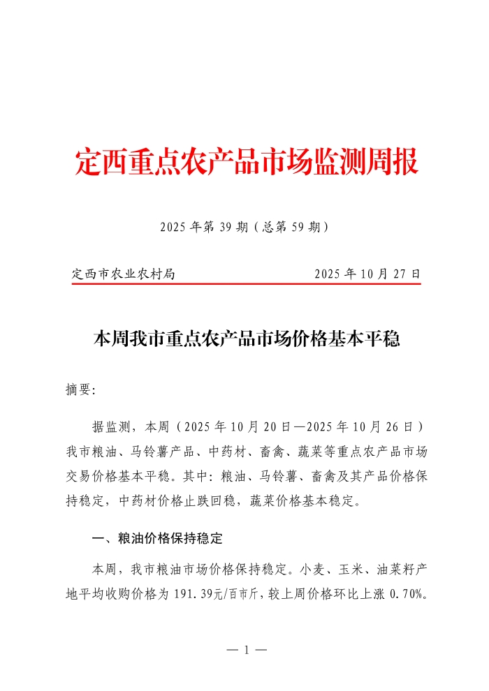 定西重点农产品市场监测周报(2025年第39期)