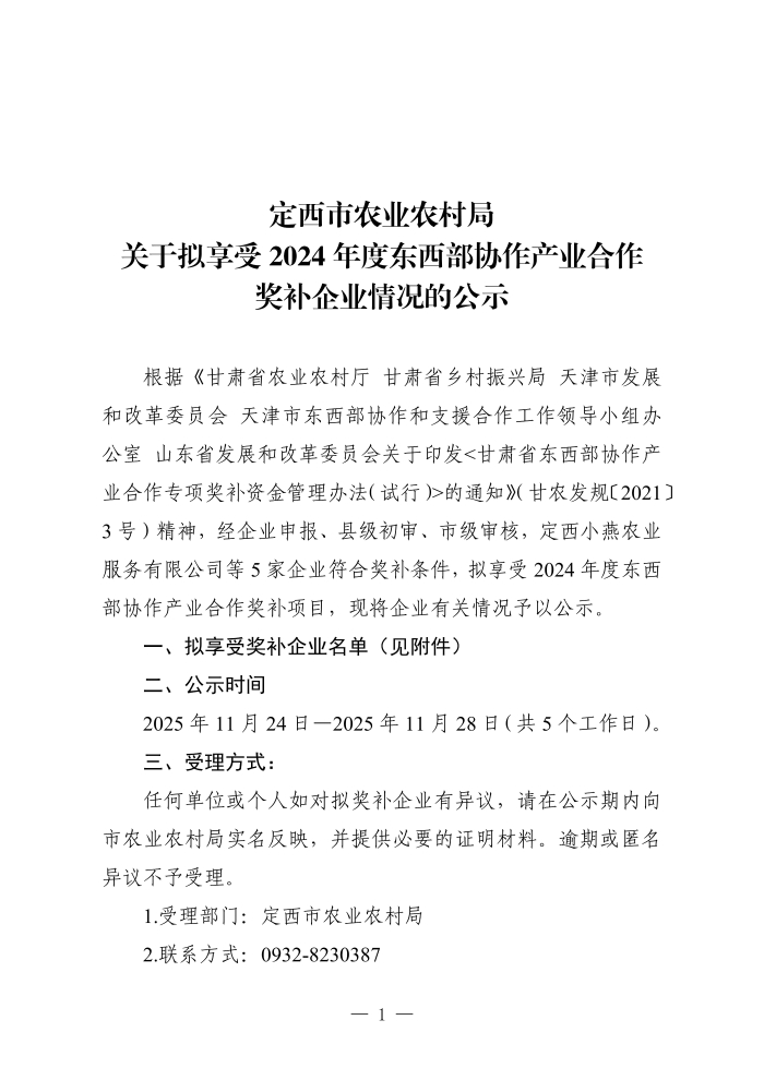 定西市农业农村局关于拟享受2024年度东西部协作产业合作奖补企业情况的公示