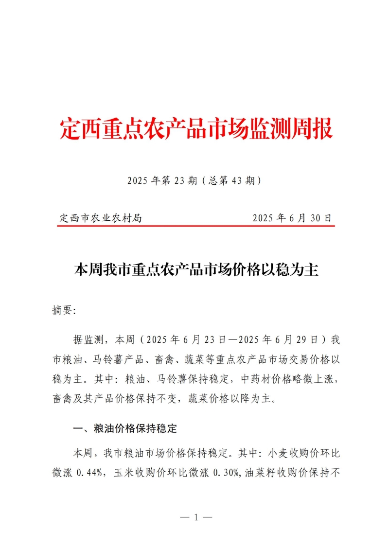 定西重点农产品市场监测周报(2025年第23期)