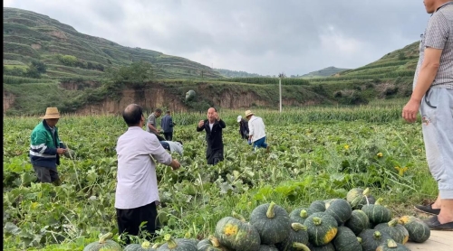 夏末时节,通渭县陇山镇川口、甘川两村的400亩贝贝南瓜迎来丰收。田垄间,南瓜藤蔓金黄、瓜体翠绿,村民们穿梭其间,采摘、装筐、装车,一派丰收景象。