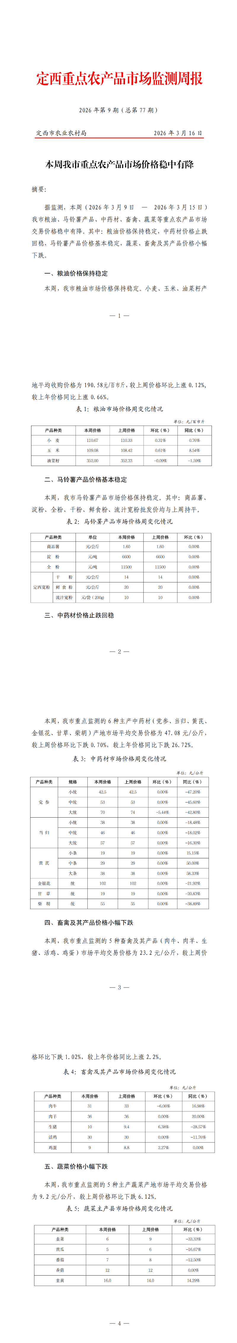 定西重点农产品市场监测周报(2026年第9期)