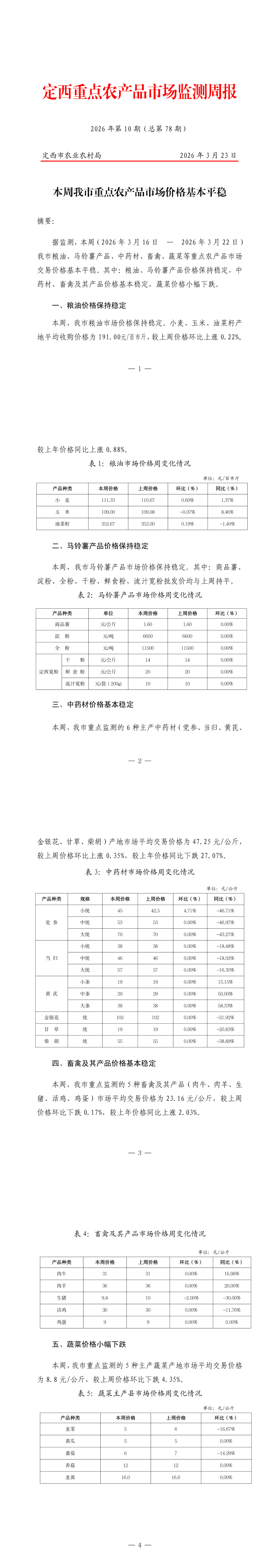 定西重点农产品市场监测周报(2026年第10期)
